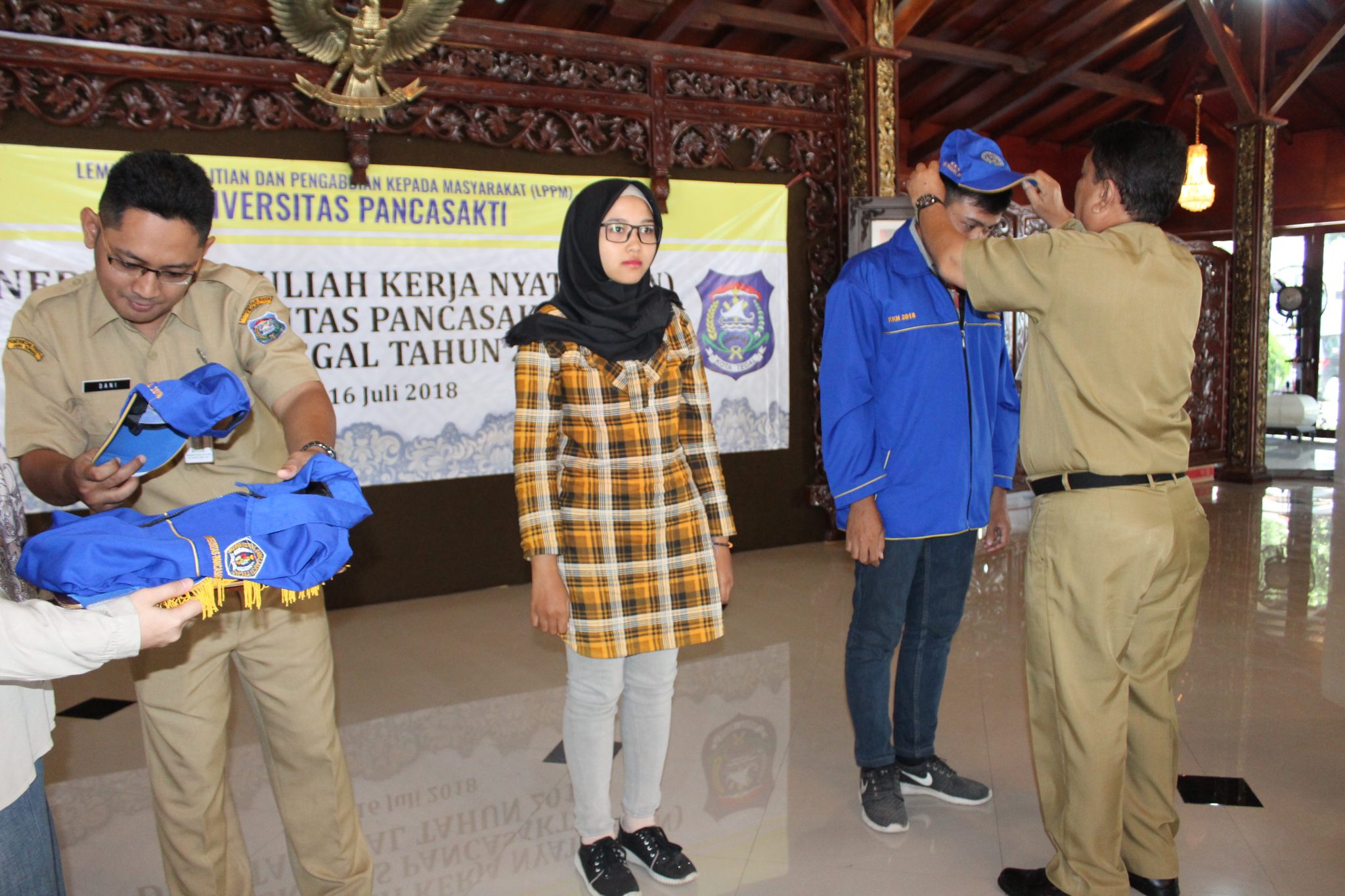 TEGAL – Penerjunan Kuliah Kerja Nyata (KKN) Mahasiswa Universitas Pancasakti Tegal tahun 2018 di Pendopo Ki Gede Sebayu Kota Tegal berlangsung di Pendopo Ki Gede Sebayu Kota Tegal. Sejumlah mahasiswa peserta KKN yang di damping civitas akademika Universitas Pancasakti Tegal serta Lembaga Penelitian dan Pengabdian kepada Masyarak (LPPM) UPS Tegal. Senin (16/7).