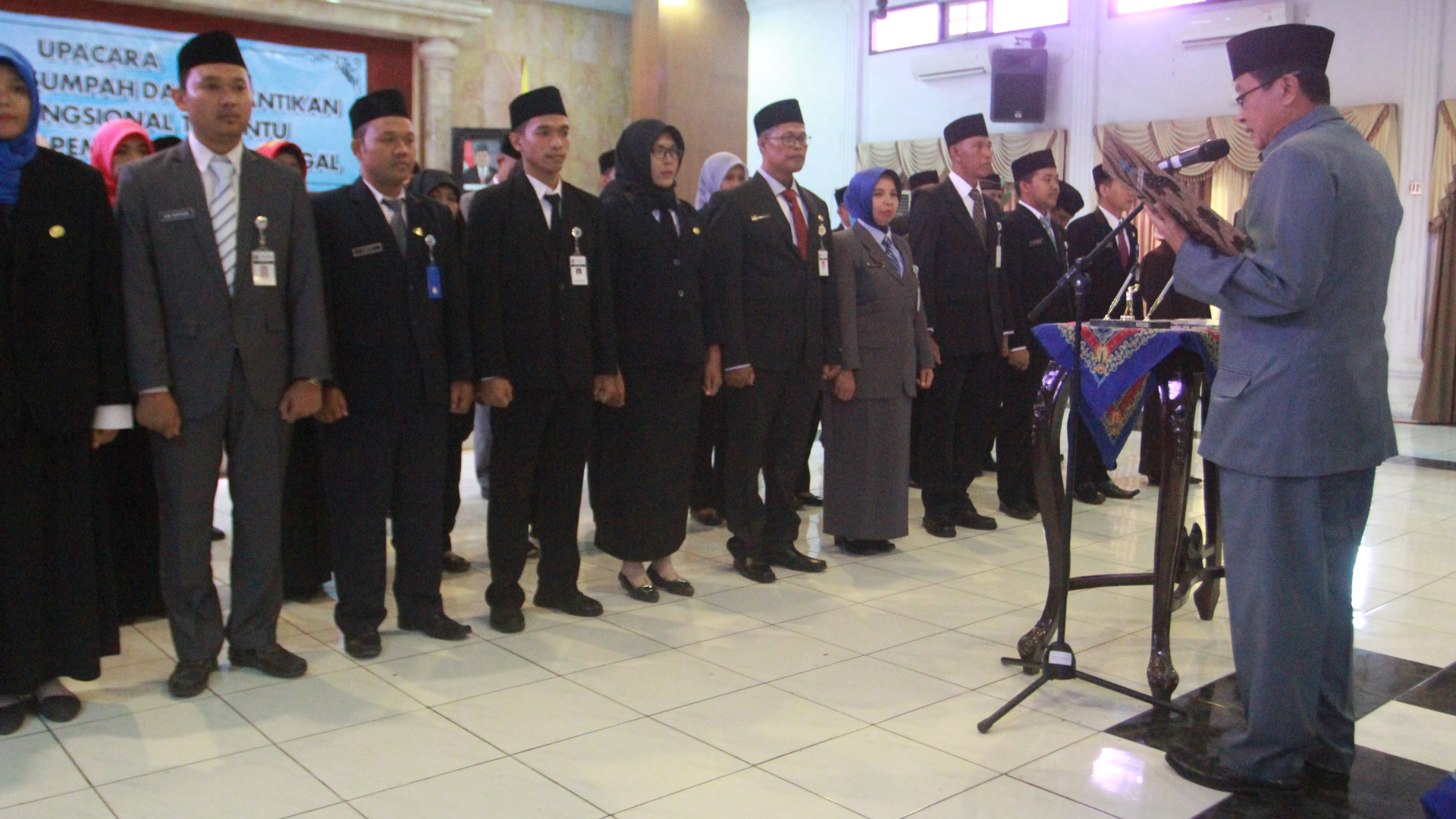 Sebanyak 40 Pagawai Negeri Sipil (PNS) di lingkungan Pemerintah Kota Tegal, dilantik menjadi Pegawai Jabatan Fungsional Tertentu (JFT), pengambilan Sumpah dan Pelantikan Pejabat Fungsional Tertentu di Lingkungan Pemerintah Kota Tegal dilaksanakan, Selasa (9/10) di gedung Adipura Kompleks Balai Kota Tegal.