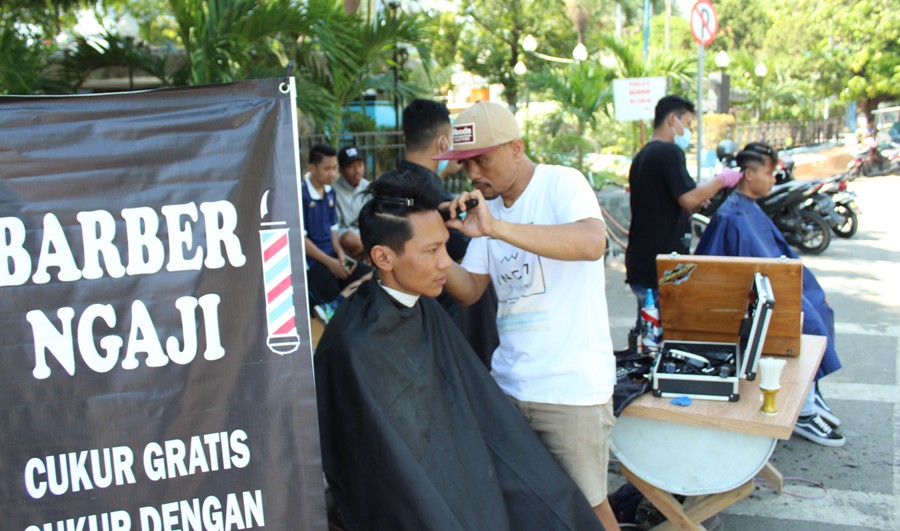 TEGAL-Barber Ngaji, hadir dikawasan Alun-alun Kota Tegal, tiap Jum’at pagi. Barber ngaji memberikaan pelayanan potong rambut gratis hanya dengan membaca salah satu ayat Al Qur’an.