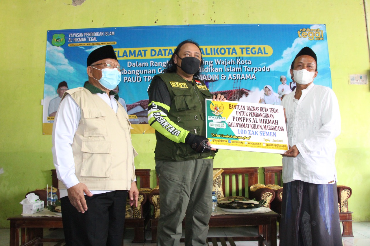 TEGAL -Wali Kota Tegal, H. Dedy Yon Supriyono menyerahkan secara langsung 100 sak semen kepada Yayasan Pondok Pesantren Al Hikmah dan diterima langsung oleh Pengurus Pondok Pesantren tersebut, Makdum Mutaqin, Jum’at (11/06/2021) di Halaman Ponpes Al Hikmah saat rangkaian kegiatan Monitoring Wajah Kota.
