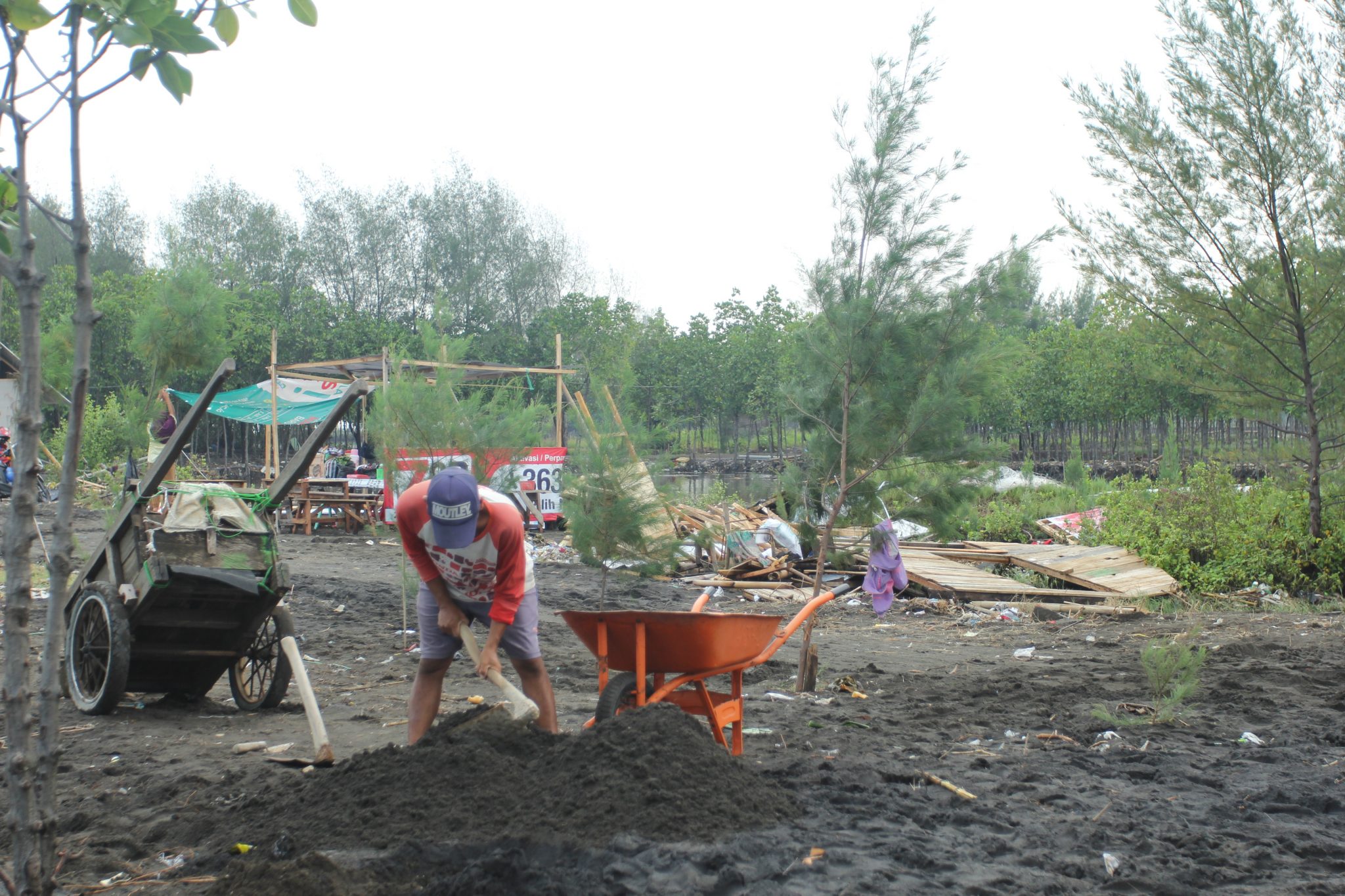Terlihat warung-warung yang terterjang ombak dalam keadaan berantakan, bahkan ada pula dibiarakan apa adanya. Ada pula yang memperbaiki dengan alat dan bahan seadannya.